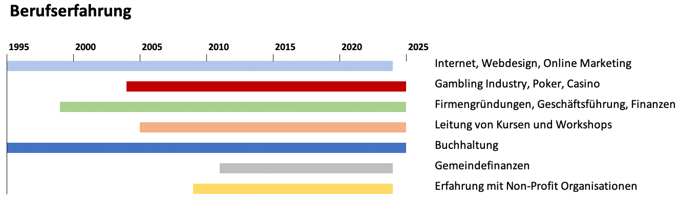 Als passionierte Pokerspielerin arbeitet sie täglich daran, in jeder Sparte des Lebens gute Karten in der Hand zu halten. Dies durch den regelmässigen Besuch von Kursen, Workshops und Referaten, denn lebenslanges Lernen muss zum Alltag gehören.